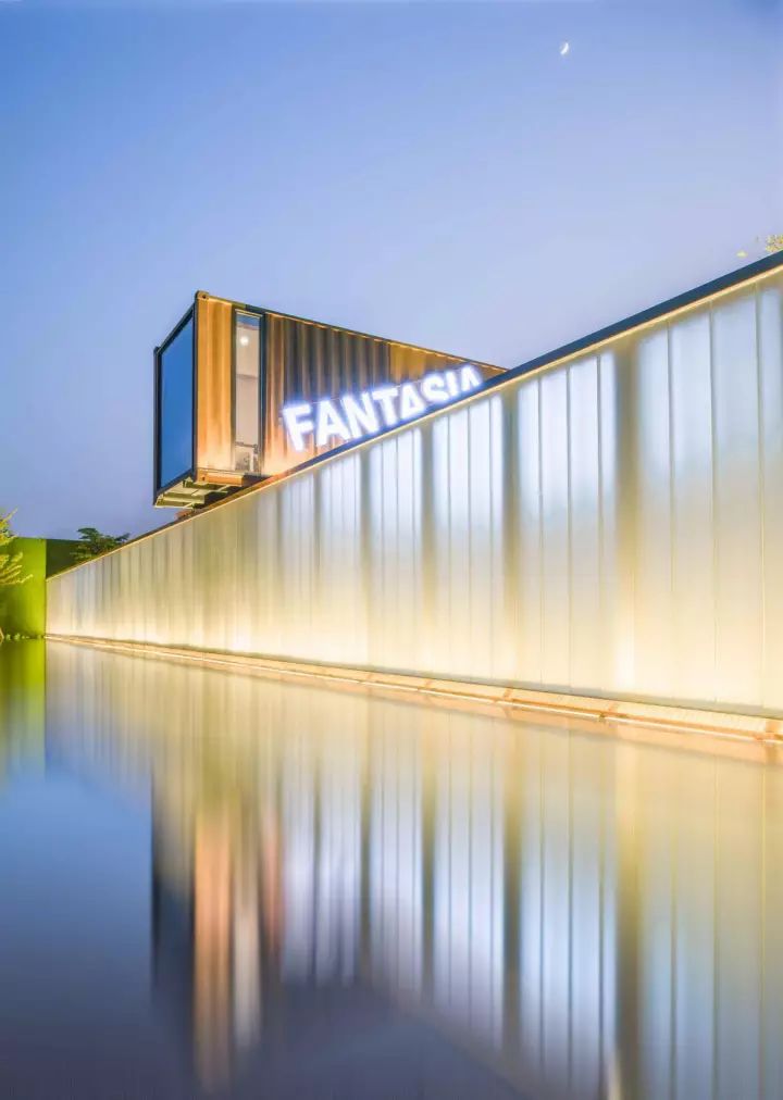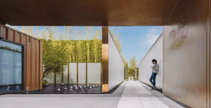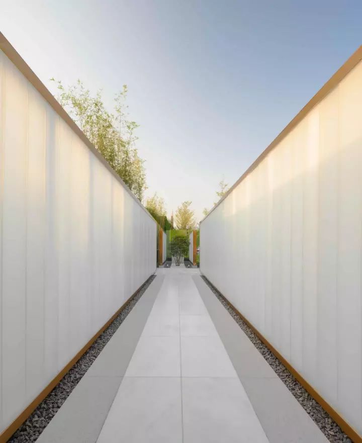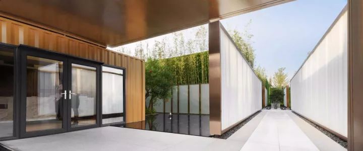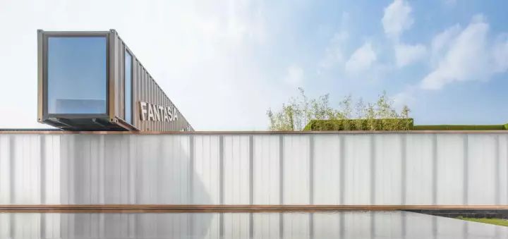 先看外部:項(xiàng)目外圍的兩道U型玻璃景墻,把集裝箱建筑圍合在內(nèi)部,無(wú)法一眼看到真容。