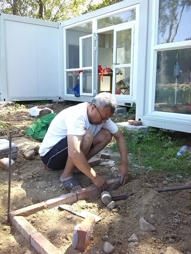 在牛大叔的努力之下,壘地板基和修小路播種,還有掛花、掛架組裝完成后,牛大叔開始了他的集裝箱裝修之旅。