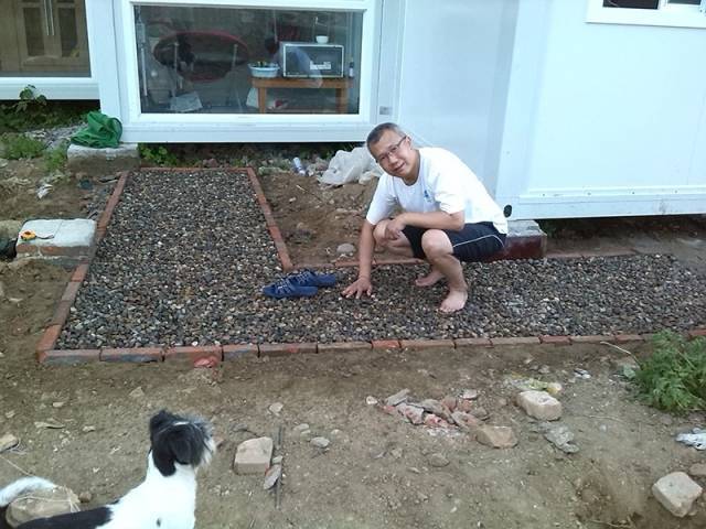 ▼集裝箱邊上的小路,全部是裝修廢棄的碎料,省時省力又省錢,并且牛大叔還在一旁加入了一些舊磚頭和安全王。