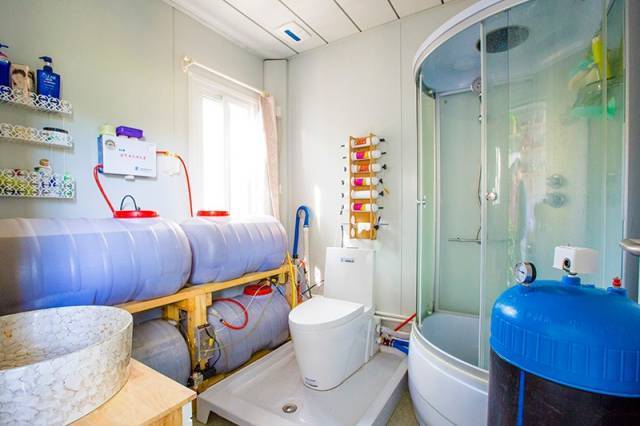 ▼高科技感的衛(wèi)生間設(shè)計,而衛(wèi)生間設(shè)計,也是科技感滿滿,日常糞便,通過管道進入大桶,并且會發(fā)酵成沼氣,消毒后通過氣壓,直接成為農(nóng)肥,可以直接滴灌到屋頂?shù)牟藞@花園里!