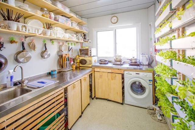 而廚房的墻面之上,牛大叔設(shè)計了一個立體的墻面菜園。墻面上,提供了太陽能發(fā)電LED植物生長燈,在廚房的墻壁上,就可以直接種菜,這個想法,簡直太天馬行空了!