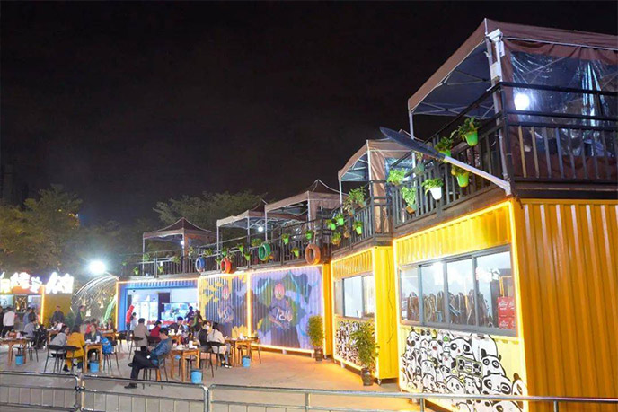 “公園共匯聚了13個集裝箱,每個都有不同格調和內容,匯聚了全國各地的特色美食。”“公園里·夜市”項目工程部經理季東說,一些集裝箱還設置了二層休閑天臺,造型新穎獨特,希望打造一個集拍照打卡、啤酒燒烤和夜市擺攤于一體的夜間集市。