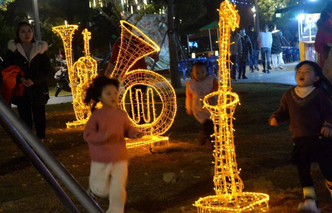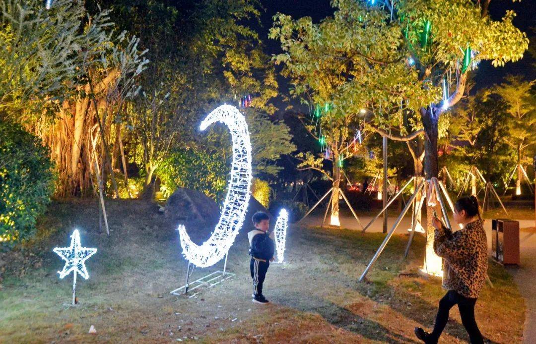 集裝箱元素只是高新區夜色經濟街區的一道風景。沿著閃爍的動態隧道燈走進公園,如同穿梭時空隧道,里面的景象別有洞天。“流星雨”燈組讓公園的綠樹流光溢彩、晶瑩璀璨,“星月童話”燈組將銀燦燦的“星星”和“月亮”散落在草地上,浪漫唯美、如夢如幻。