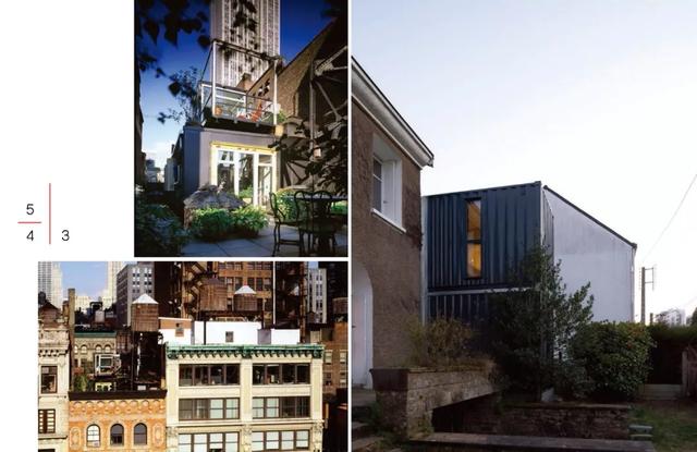 在擴建方面,集裝箱自身的獨立結構性具有很大的優勢。它是擴建既有建筑的一個快速有效的工具,具有類似即插即用的功能,并且如果需求消失或改變,它們可以很輕松的被拆除和回收,它們可以應用在水平向的空間拓展上(下圖3)也可以應用在屋頂的擴建之中(下圖4、5)。