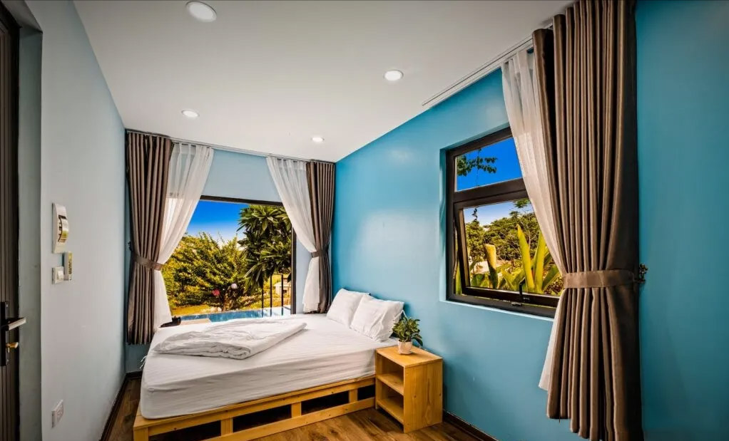 這棟豪華別墅擁有多個休閑場所和生活區,包括三間臥室、一間浴室、一間廚房、一張餐桌、一間客廳、一個游泳池和燒烤區。不同的臥室設計風格相異,采用不同的鮮明色彩區分,每間臥室都開設了窗戶來透光和通風。