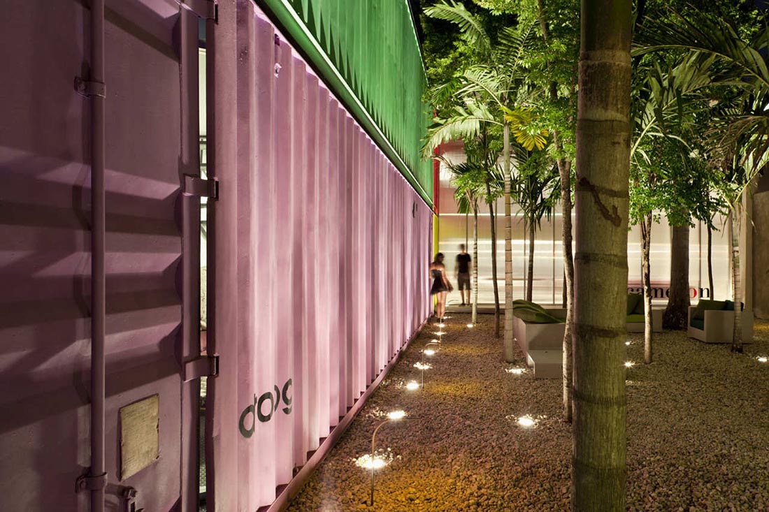 當時的想法是用二手的集裝箱,重新組成一個現成的對象。該項目利用集裝箱組織了兩條通道,同時其內部空間發揮線性的優勢,和一個雙層高度的體量依附于它,對比立方體體積。巨大的聚碳酸酯推拉門連接商店與城市的一個內花園。
