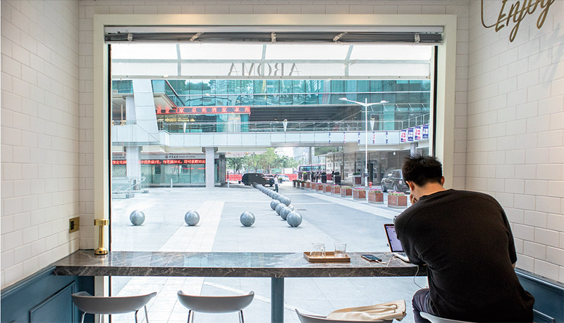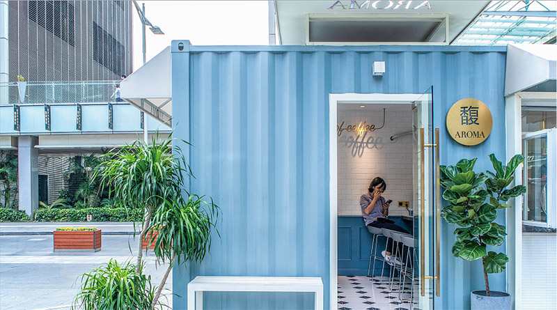 Aroma Coffee 藏在福田 CBD 的一群高樓大廈底下,低飽和度的霧靄灰藍色集裝箱外形在深圳來說,還是有一分與眾不同,開業(yè)不久就已成為附近白領(lǐng)的每日打卡點。