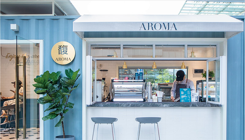 干凈簡潔的室內(nèi)風(fēng)格加上占據(jù)集裝箱整個側(cè)面的透亮玻璃窗,顯得 Aroma 的小空間一點不擁擠,反而還多了些溫馨。