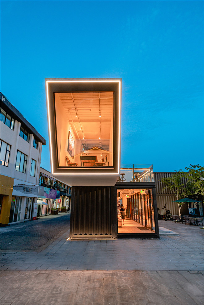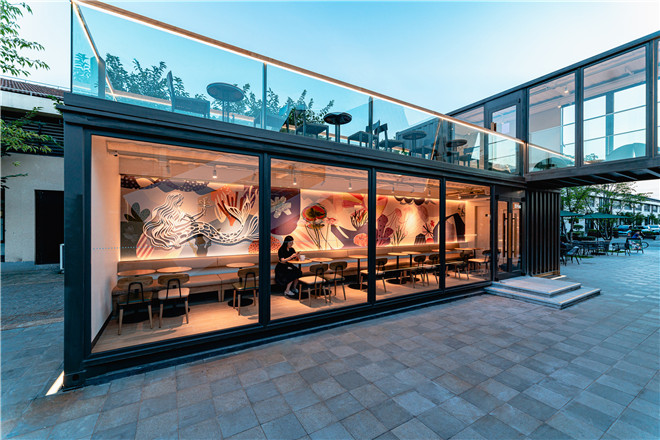 概念店由6個大小不同、白棕相間的集裝箱穿插交疊而成,共有兩層。一層是交錯開來的點單區和用餐區,并設置了大片通透的玻璃幕墻,從外界看可以將箱體內的整體面貌盡收眼底。