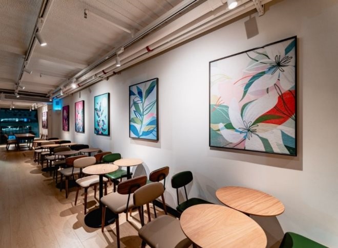 而二層純白色的空間內掛著各種現代風格的咖啡主題藝術畫作,描述著咖啡豆種植的場景,其中毛氈編織的藝術品更是再現了星巴克西雅圖首家門店的歷史感。未來還將有更多藝術品在二層空間展出,組成咖啡店里的“微型藝術展”。